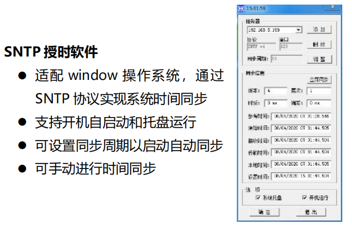 簡要參數描述 ●支持(GPS、北斗,可設置為單GPS單北斗或GPS北斗混合工作模式)衛星信號輸入,(內置恒溫晶振保持精度1ms/72h、內置銣原子鐘保持精度3ms/year),冗余220V AC供電,支持NTP、SNTP、PTP標準協議,支持windows、LINUX、UNIX、SUN SOLARIS、IBM AIX等操作系統同步,授時精度小于<2ms,網絡端口訪問容量不少于139000次/秒,1PPS脈沖精度優于30ns,嵌入式linux系統,19英寸2U機箱,支持觸摸屏設置功能,2個千兆網口,1路串口、1路PPS、4路USB、1路VGA,本機可擴展支持20路千兆電口或10路萬兆光口、網口支持Bonding功能、支持心跳檢測,共享虛擬IP地址,實現雙機熱備功能,軟件支持SNMP、syslog,EMAIL等協議告警,支持客戶端同步狀態統計、支持服務器集群服務質量監測和優選制動操作、支持遠程喚醒、定時開關機、日志記錄、Web和遠程登錄。 物理環境參數 ●尺寸:19英寸2U機箱433×89×648mm; ●重量:<12kg; ●電源:冗余100V~240V AC/145V~350V DC; ●工作溫度: -10℃~+55℃(主機); -40℃~+75℃(天線); ●存貯溫度: -45℃~+85℃; ●濕度:95%無冷凝; ●功耗:120W(晶振),150W(銣鐘)。 | 外觀 前面板 ●觸摸屏(按鍵功能),用于顯示:當前時間、參考源鎖定狀態、衛星顆數、經緯度、高度、各網卡IP、系統工作狀態等信息,支持設置衛星優先級、網絡IP地址等參數。 ●三色指示燈,用于提示:衛星鎖定狀態、內部時鐘鎖定狀態、NTP服務通信狀態、設備告警狀態等。 后面板 ●ANT: SMA,1路,衛星天線接口,5V饋電; ●ETH0-ETH1:RJ45,2路,10/100/1000M自適應以太網口; ●CONSOLE:DB9 Male,1路,RS232電平,控制終端; ●1PPS:BNC,1路,TTL電平; ●通用:標準USB接口x4、標準VGA接口x1; 選件: ●可配置5個PCI-E 插槽; ●每個插槽可支持4路千兆電口或2路SFP+萬兆光纖接口; ●外參考輸入、PTP、10MHz、IRIG-B、干接點報警、電池,(更多信息請咨詢銷售人員)。 包裝信息 基礎包裝 ●主機1臺; ●30米電纜高靈敏度授時天線1個; ●安裝支架1套; ●1米電源線1根; ●1.5米控制線1根; ●中文說明書1本; ●資料光盤1張(說明書, SNTP授時軟件, NTSM監控軟件,設備使用說明書)。 可選配件 ●天饋線避雷器; ●特型電纜:50、80、100米; ●便攜式手持校準單元; ●網口數碼子鐘。 |