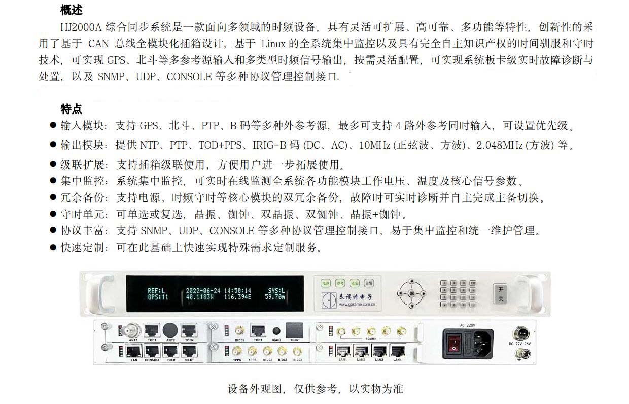 HJ2000A 綜合同步系統是一款面向多領域的時頻設備,具有靈活可擴展、高可靠、多功能等特性,創新性的采用了基于CAN總線全模塊化插箱設計,基于Linux 的全系統集中監控以及具有完全自主知識產權的時間馴服和守時技術,可實現 GPS、北斗等多參考源輸入和多類型時頻信號輸出,按需靈活配置,可實現系統板卡級實時故障診斷與處置,以及 SNMP、UDP、CONSOLE 等多種協議管理控制接口,可廣泛應用于...